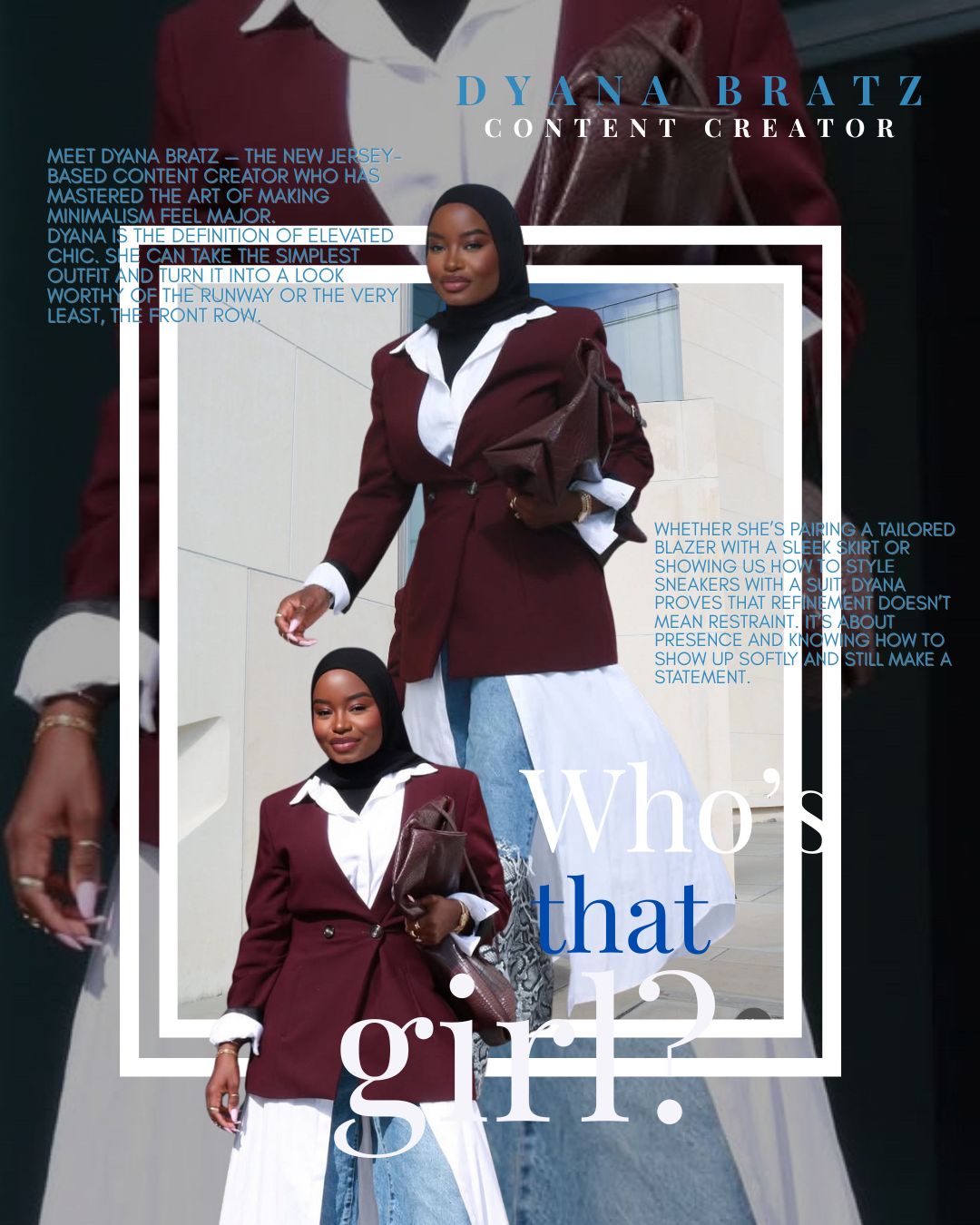 Through her lens, modest fashion isn’t just about covering. It can be about curating. It’s knowing when to layer, when to let texture speak, and when to add a structured blazer to say, “I have arrived.” Dyana’s love for quality over quantity and her fearless blend of sneakers with suits reminds us that true style lives in the details and that effortlessness is, in fact, an art form.